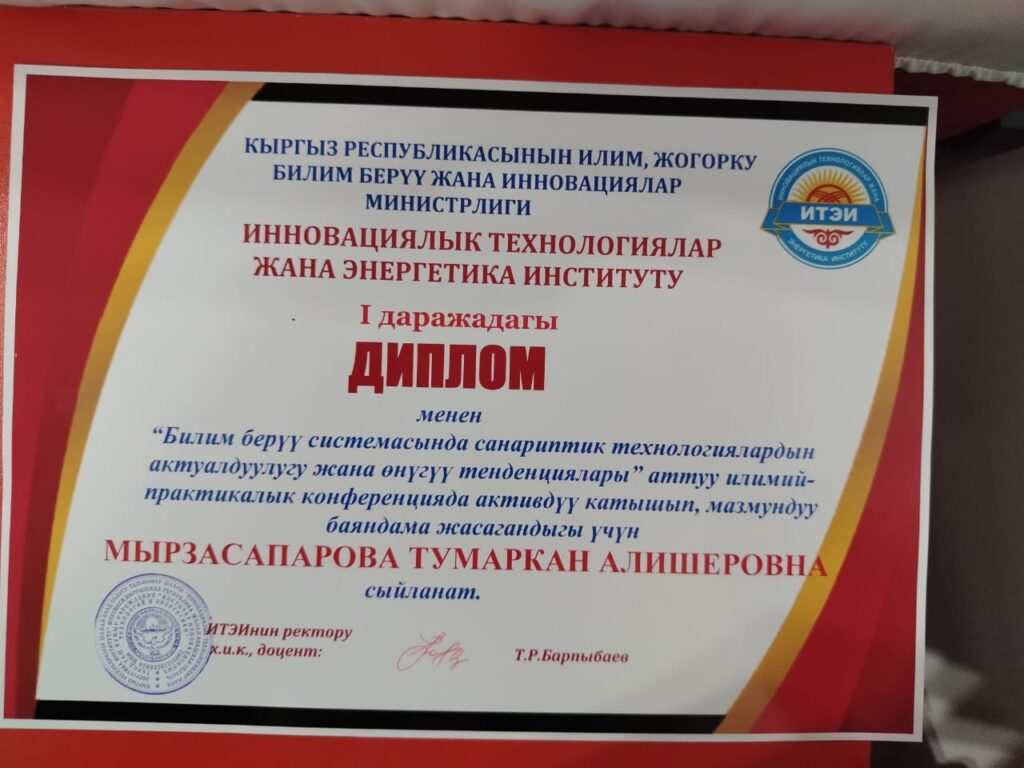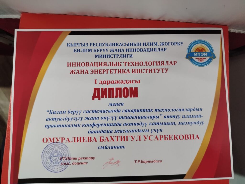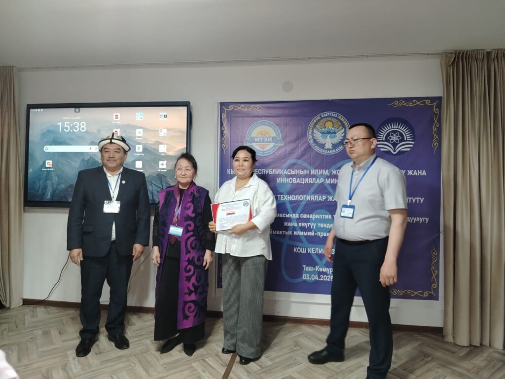 2026-жылдын 3-апрель куну Таш-Комур шаарындагы «Иновациялык технологиялар жана энергетика институтунда» откорулгон “Улуттук дем – дүйнөлүк бийиктик” уңгужолунунун алкагында өткөрүлүп жаткан “Билим берүү системасында санариптик технологиялардын актуалдуулугу жана өнүгүү тенденциялары” аттуу аймактык илимий -практикалык конференциясына Майлуу-Суу колледжинин география окутуучусу Мырзасапарова Тумаркан Алишеровна жана атайын сабактар боюнча окутуучу Омаралиева Бахтигуль Усарбаевна катышып мыкты баяндамасы учун биринчи даражадагы дипломдор менен сыйланышты.