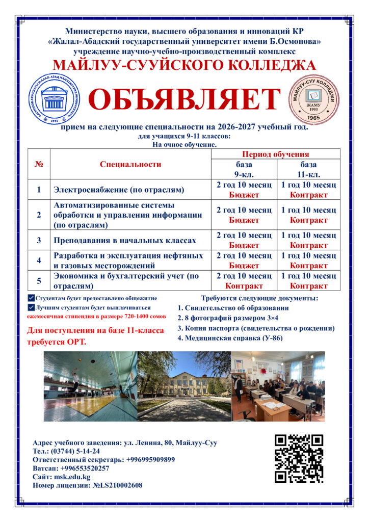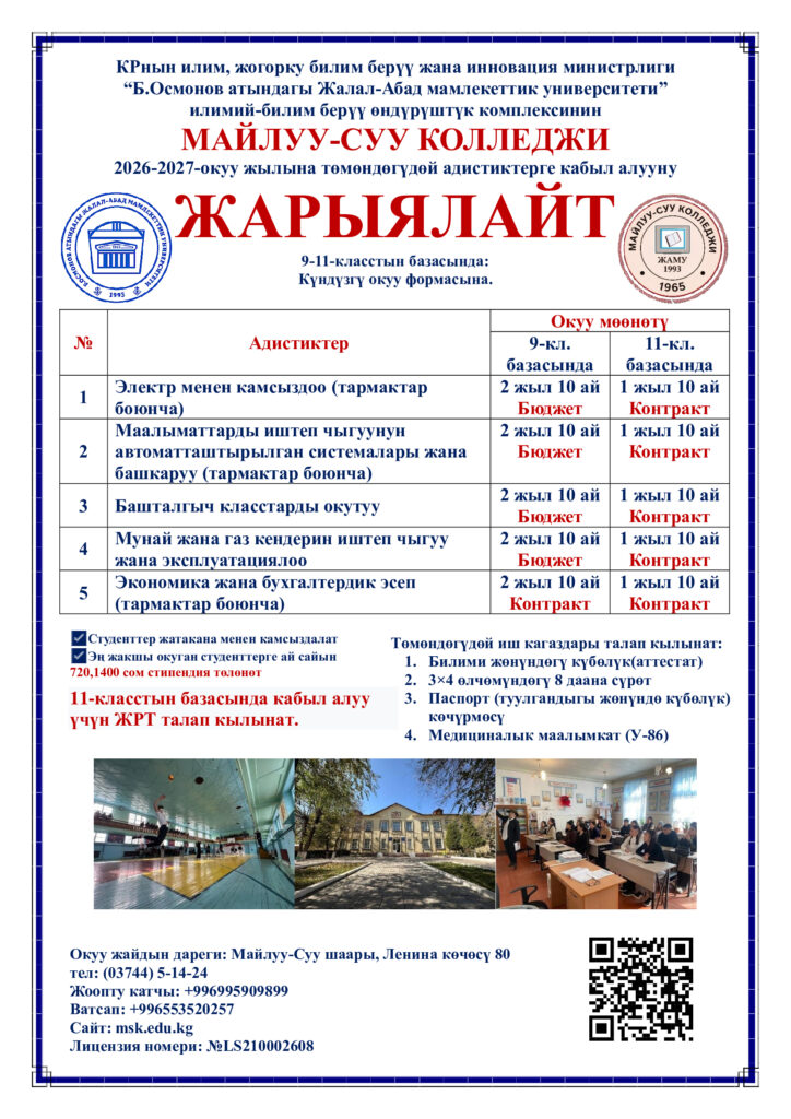 2026-2027-окуу жылына гранттык (бюджеттик) жана контрактык орундардын күндүзгү жана сырттан окуу тайпаларына кабыл алат.