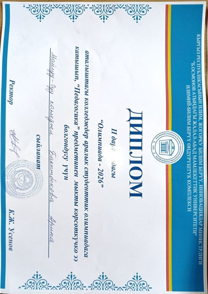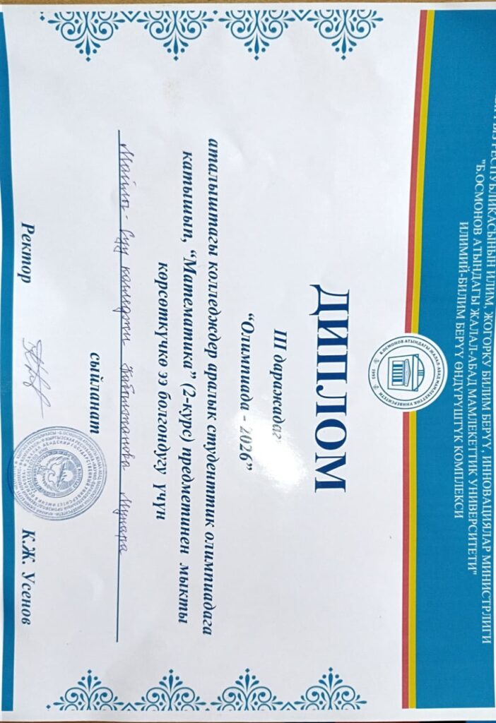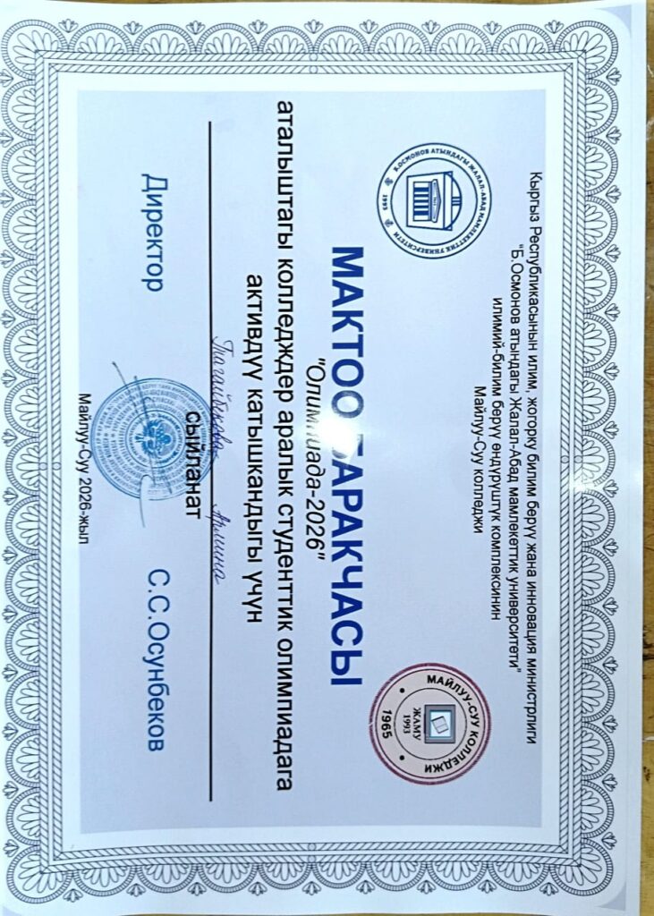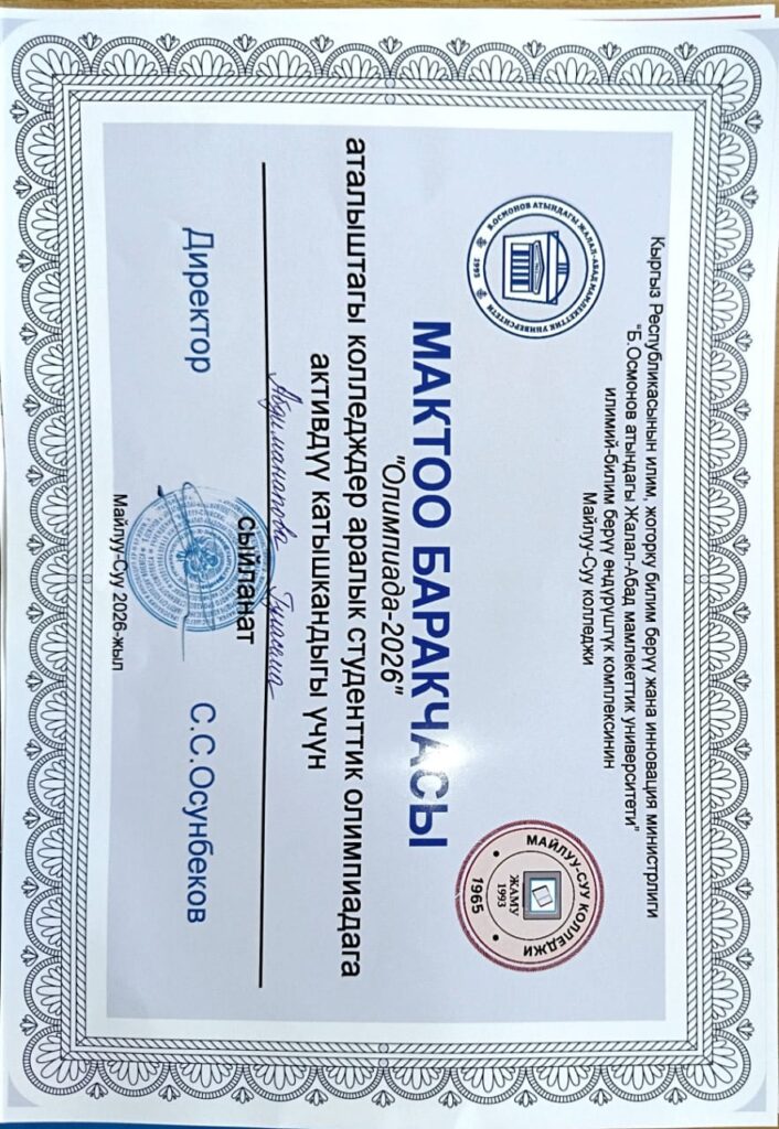 Б. Осмонов атындагы илимий-билим беруу ондуруштук комплекси Жалал-Абад мамлекеттик университети Орто кесиптик окуу жайлардын арасында «ОЛИМПИАДА-2026» аталышындагы Колеждер аралык олимпиадага Майлуу-Суу колледжинин студенттери 15 предметтен катышып 6 байгелуу орундукка жетишти. Атап айтсак Чет тили предметинен Калдарова Эркинай биринчи даражадагы диплом менен сыйланды жана Биология предметинен Салыева А 2-орун Педагогика предметинен Бактыбекова А 2-орун Кырг тили Абышева А 3-орун Экология (жашыл кондумдор) Иманбеков С 2-орун Кабылжанова Мунара математика предметинен 3-орунду алышты ЖАМУ тарабынан дипломдор менен сыйланышты. Калган студенттер активдуу катышкандыгы учун Майлуу-Суу колледжинин администрациясы тарабынан Мактоо баракчалары менен сыйланышты.