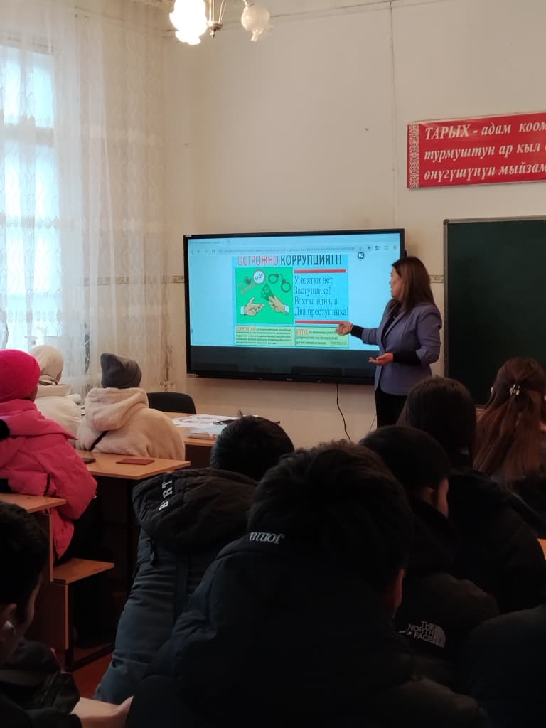 «Б.Осмонов атындагы Жалал-Абад мамлекеттик университети» илимий-билим берүү өндүрүштүк комплексинин Майлуу-Суу колледжинде «Коррупцияга жол жок!!!» деген темада тарбиялык сабак өттү. Сабактын жүрүшүндө коррупциянын коомго тийгизген зыяны, анын кесепеттери жана аны алдын алуу жолдору жөнүндө сөз болду. Мугалим адилеттүүлүк, мыйзамды сактоо жана жоопкерчилик тууралуу кеңири түшүндүрүп берди.