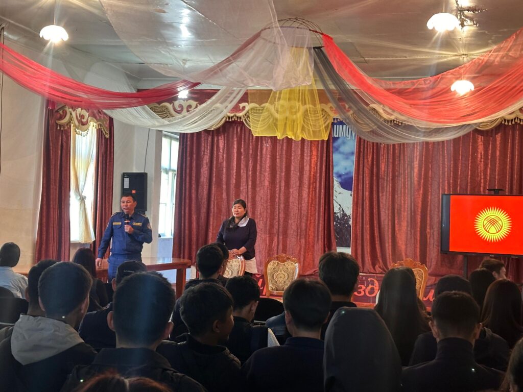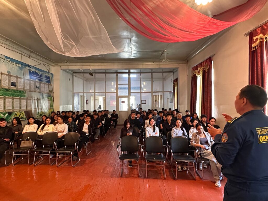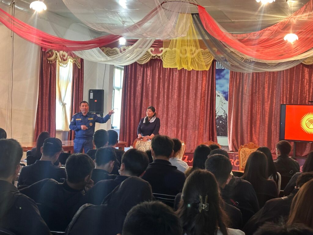 Майлуу-Суу шаардык ӨКБнүн ӨӨжААБнүн башчысы майор Абдыраманов Бекбол Ашимжанович «Б. Осмонов атындагы ЖАМУ» илимий-билим берүү өндүрүштүк комплексинин Майлуу-Суу колледжинин студенттерине коопсуздук эрежелер боюнча таныштыруу сабак өтүп, өрт чыккан учурда биринчи кезекте эмне кылуу керектигин түшүндүрдү, өзгөчө кырдаалдар болгон жагдайда коопсуздук эрежелери менен тааныштырып жана кайсы номерлерге чалып билдирүү керектигин айтып, коопсуздук эрежелери менен тааныштырып, сак болууну эскертти.