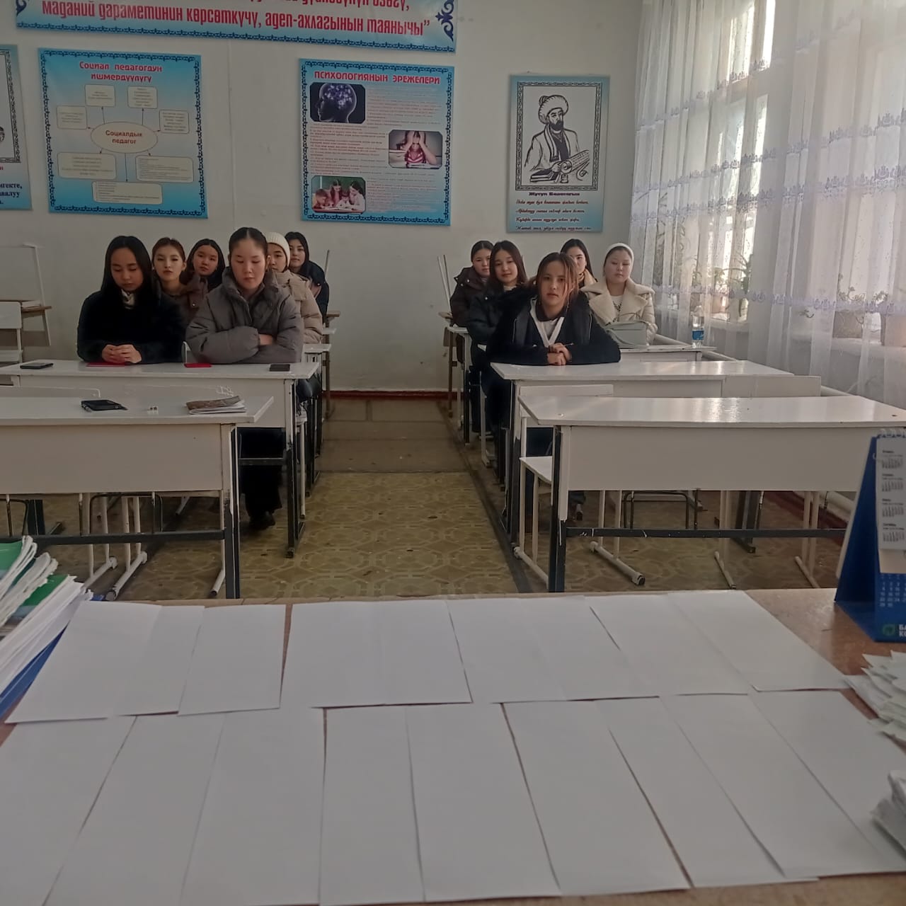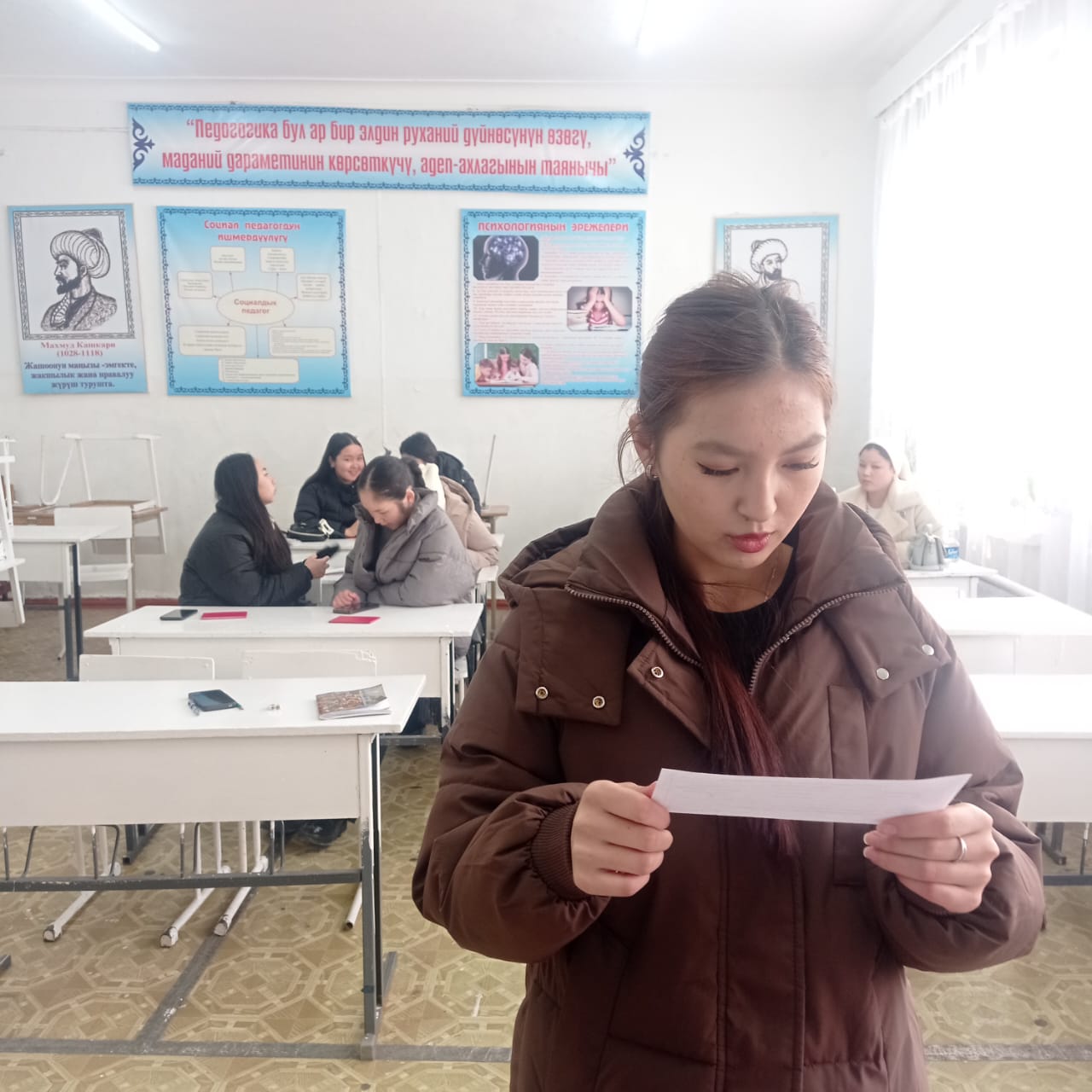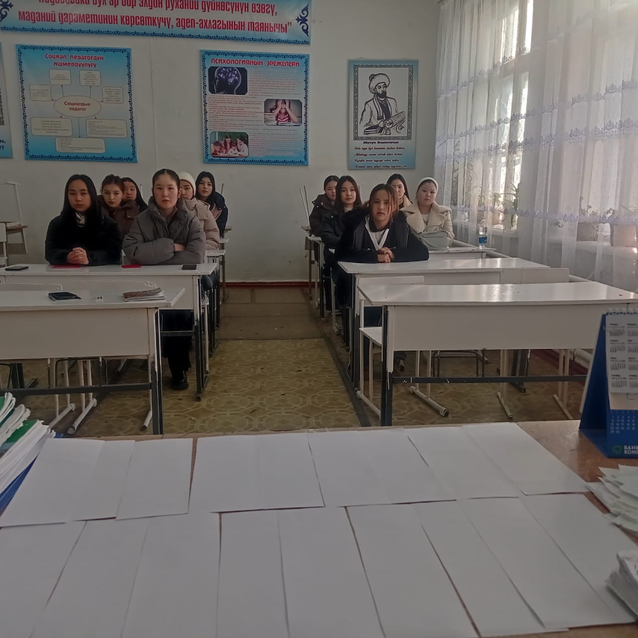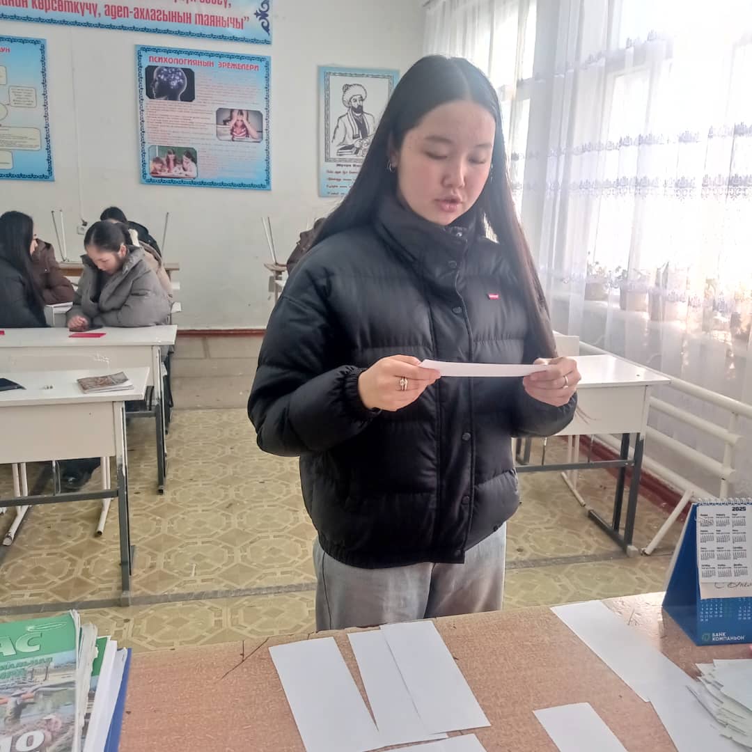 «Б.Осмонов атындагы Жалал-Абад мамлекеттик университети» илимий-билим берүү өндүрүштүк комплексинин Майлуу-Суу колледжинин БКМ -1-23 тайпасы 26-январь күнү Мекен таануу сабагынан экзамен тапшырып жаткан учуру.