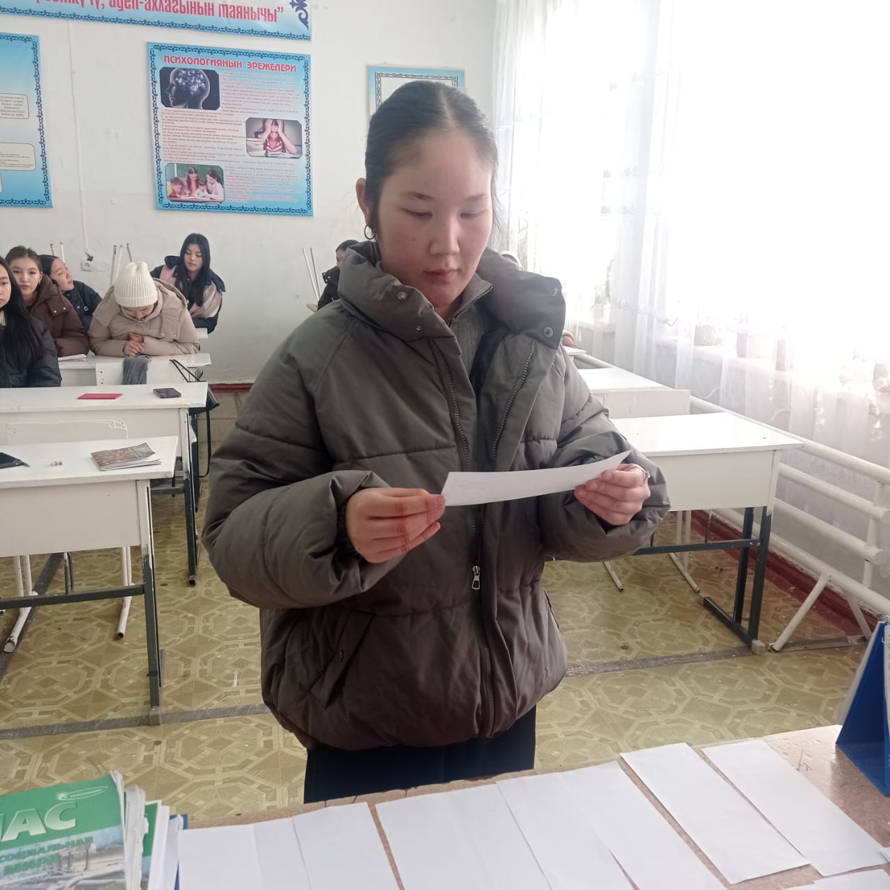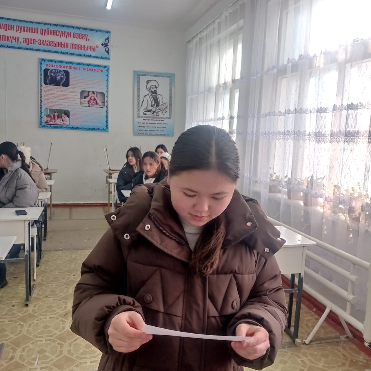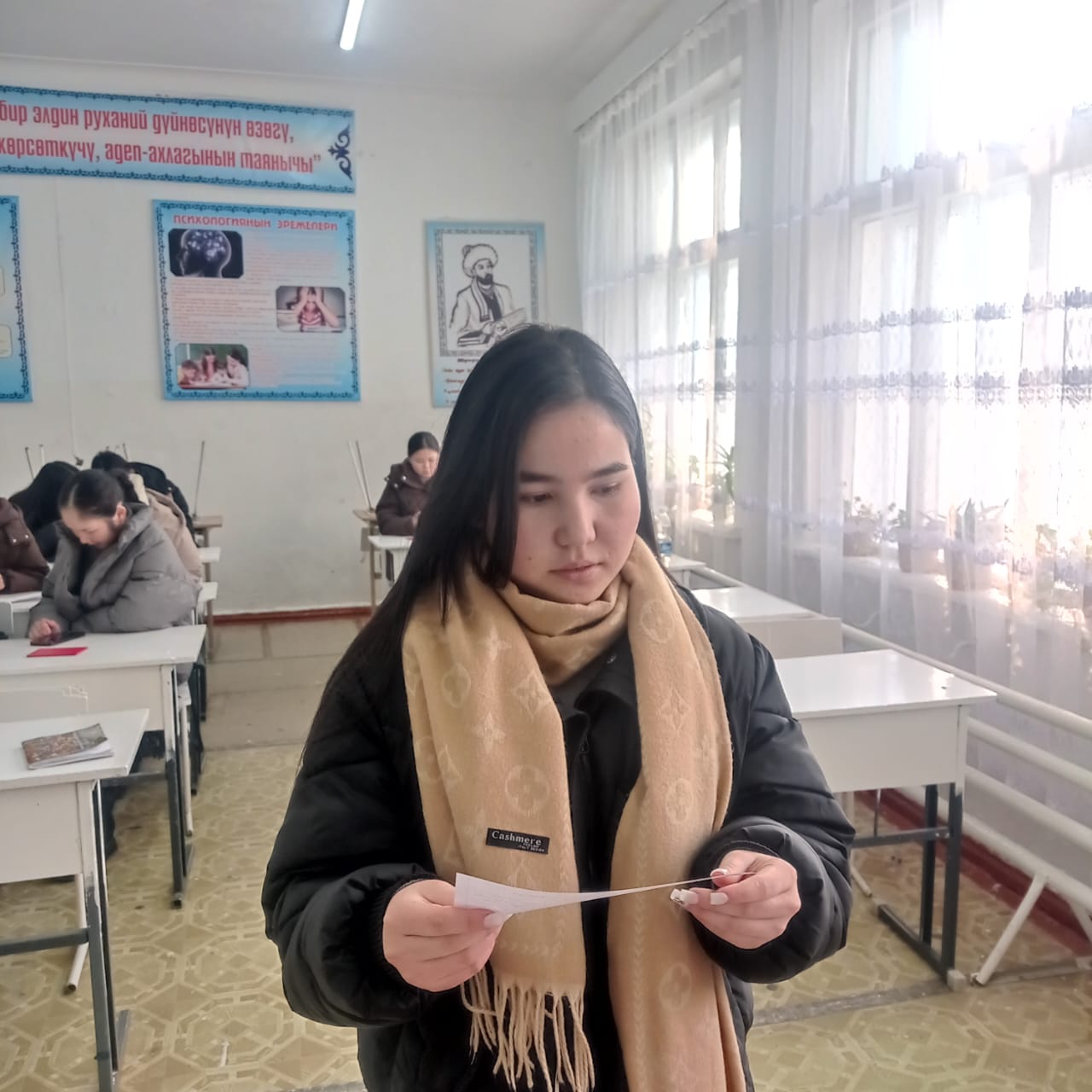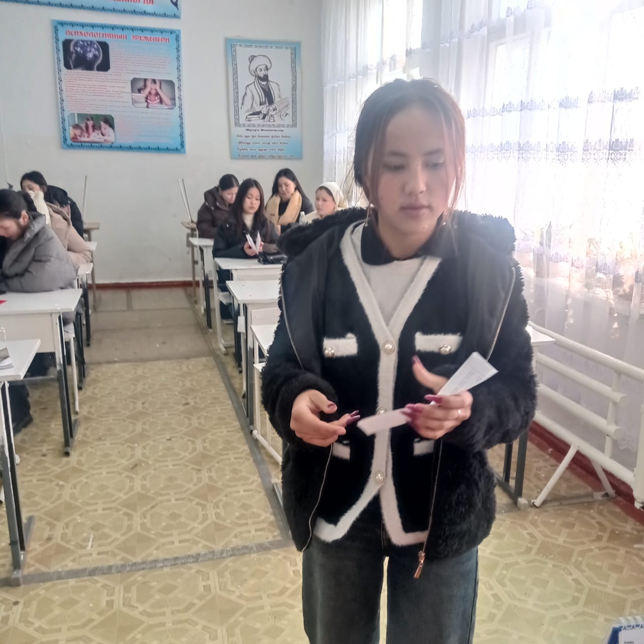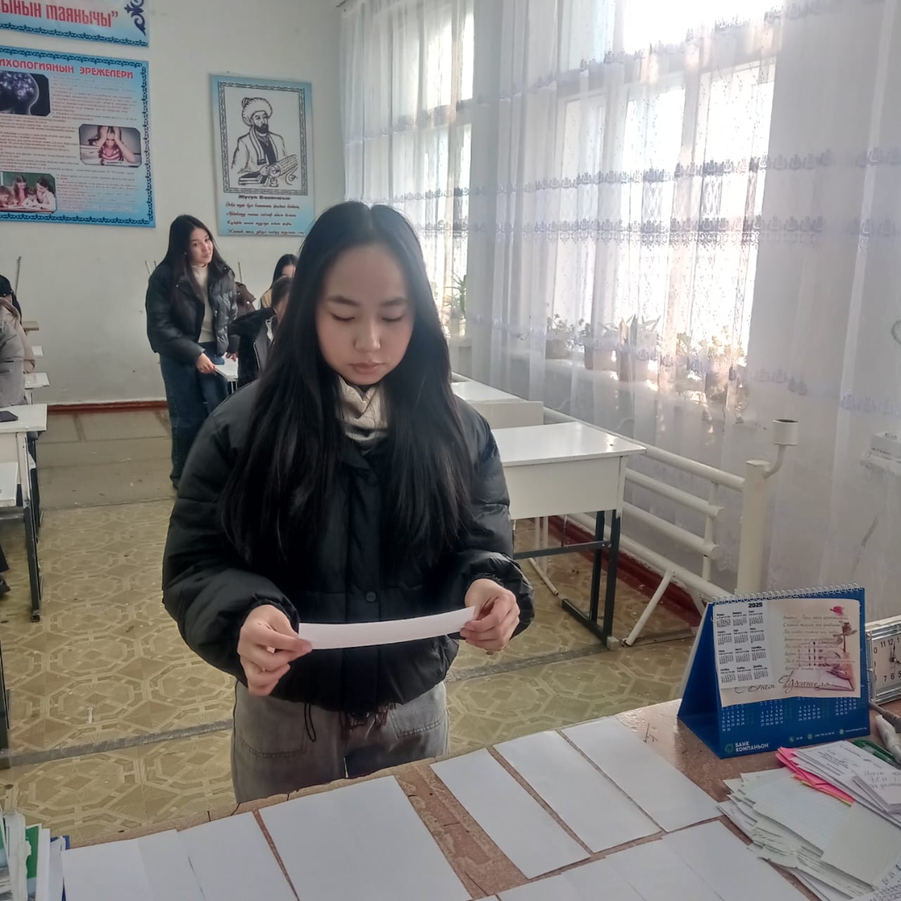 «Б.Осмонов атындагы Жалал-Абад мамлекеттик университети» илимий-билим берүү өндүрүштүк комплексинин Майлуу-Суу колледжинин БКМ -1-23 тайпасы 26-январь күнү Мекен таануу сабагынан экзамен тапшырып жаткан учуру.