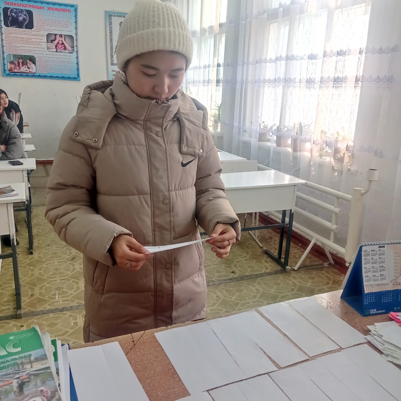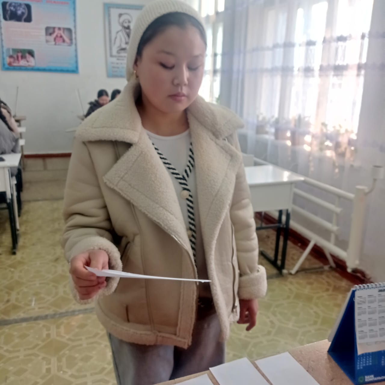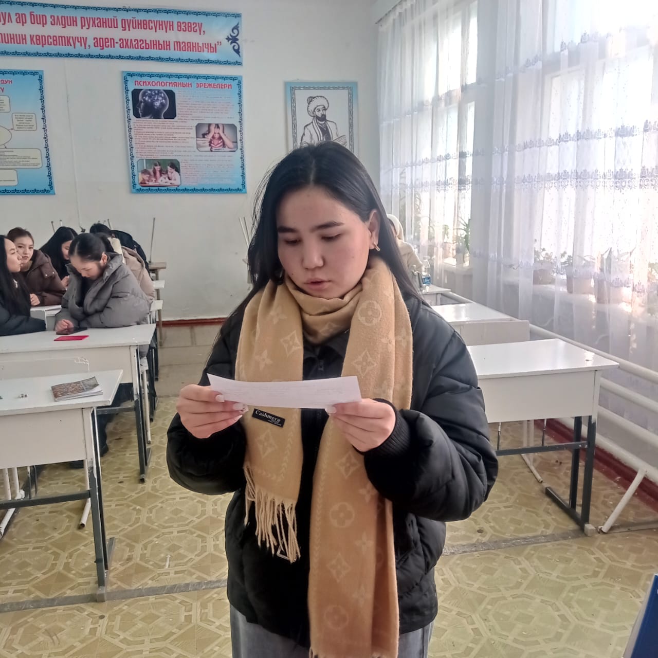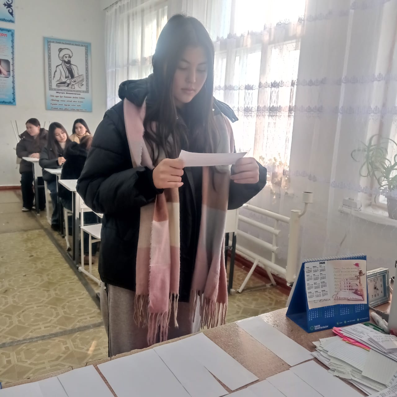 «Б.Осмонов атындагы Жалал-Абад мамлекеттик университети» илимий-билим берүү өндүрүштүк комплексинин Майлуу-Суу колледжинин БКМ -1-23 тайпасы 26-январь күнү Мекен таануу сабагынан экзамен тапшырып жаткан учуру.