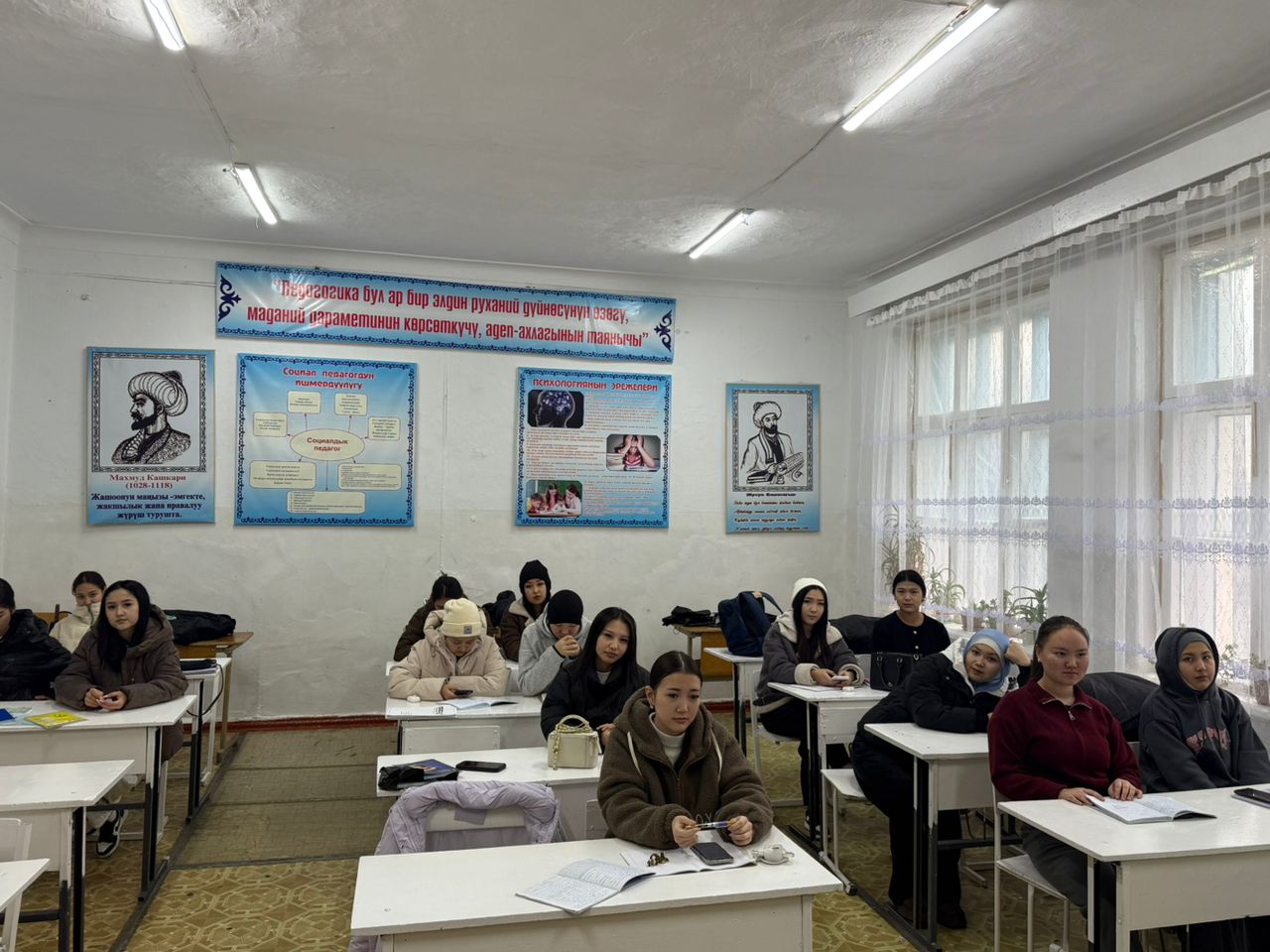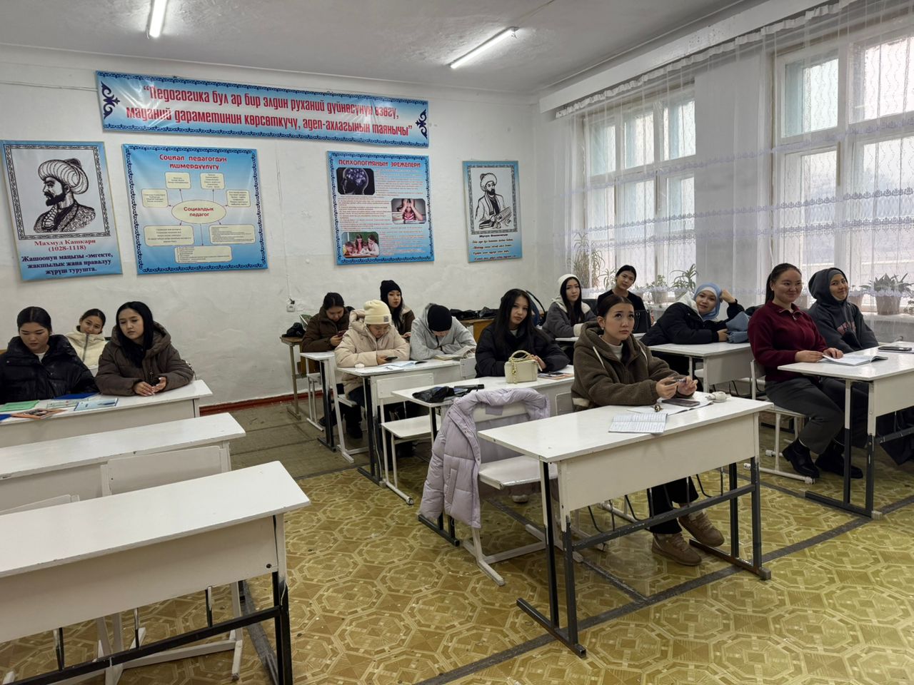 «Б.Осмонов атындагы Жалал-Абад мамлекеттик университети» илимий-билим берүү өндүрүштүк комплексинин Майлуу-Суу колледжинде 17-декабрь Психология предметинен БКМ-1-24 тайпасынsy студенттеринен модуль тапшырып жаткан учуру.
