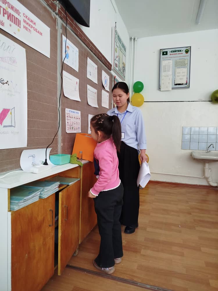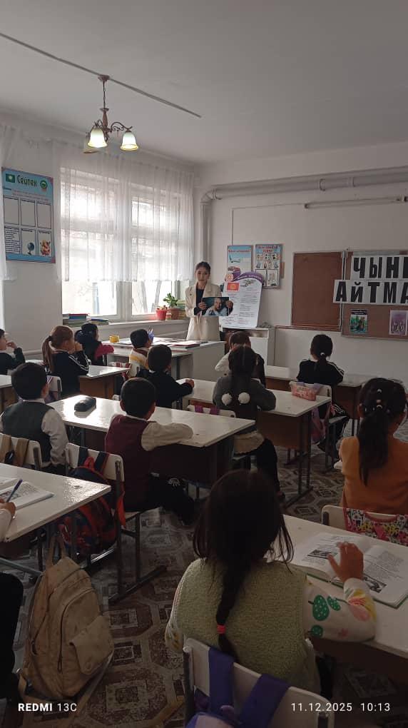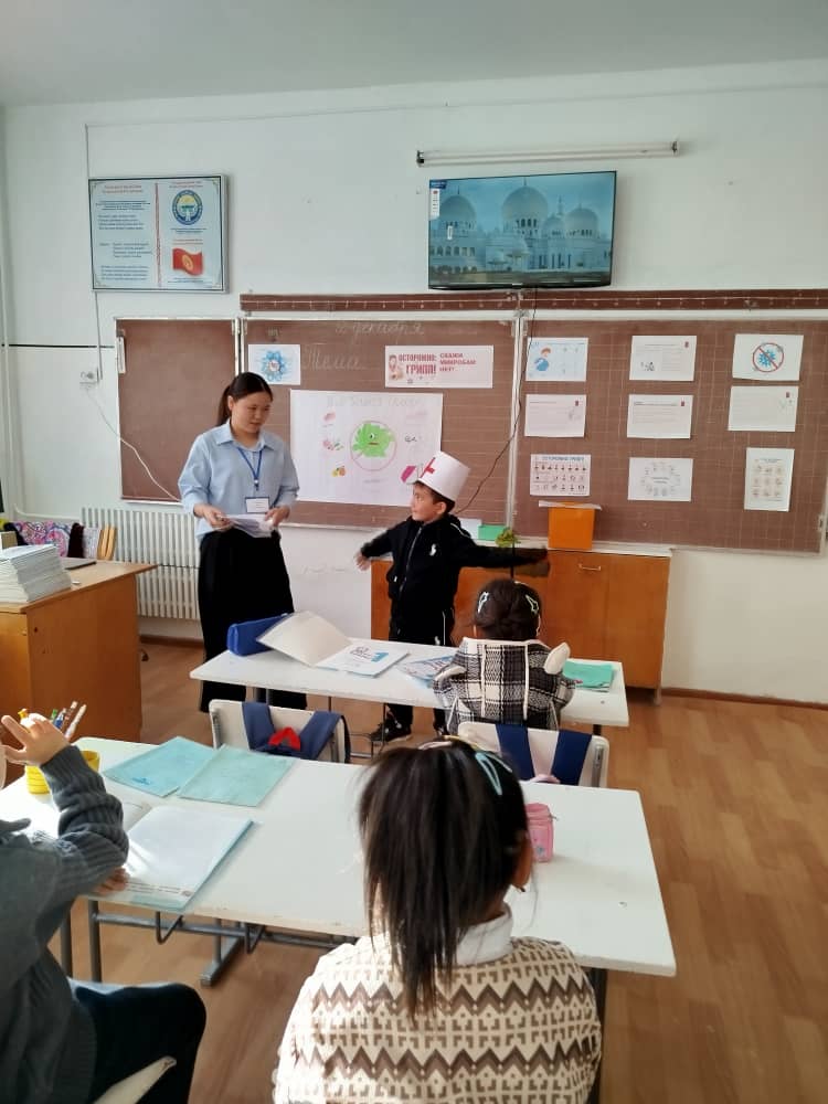 “Б.Осмонов атындагы Жалал-Абад мамлекеттик университети” илимий- билим берүү өндүрүштүк комплексинин Майлуу-Суу колледжи” мекемеси. “ Башталгыч класстардын мугалими” 3-курстун студенти Сагынбаева Азиза педагогикалык практика учурунда Майлуу-Суу шаарынын №8 орто мектебинин 2-класстын окуучуларына «Грипп жана анын алдын алуу» темасында тарбиялык ачык саат өткөрдү.